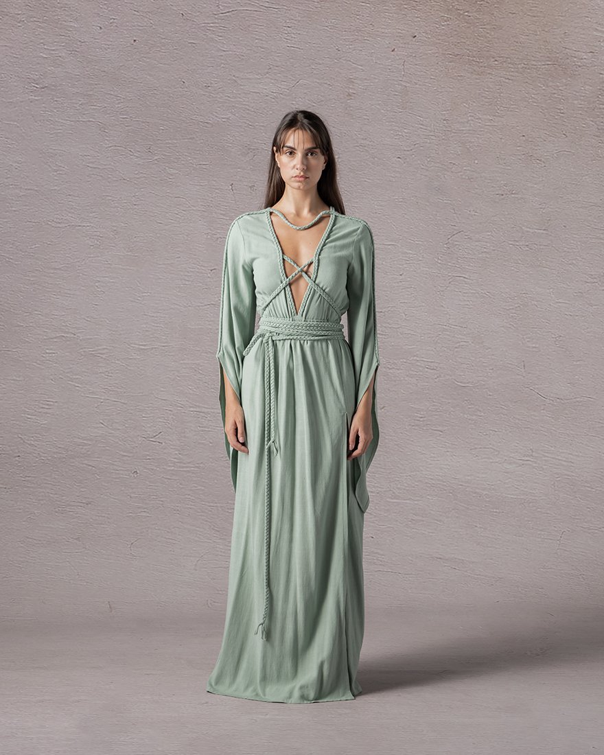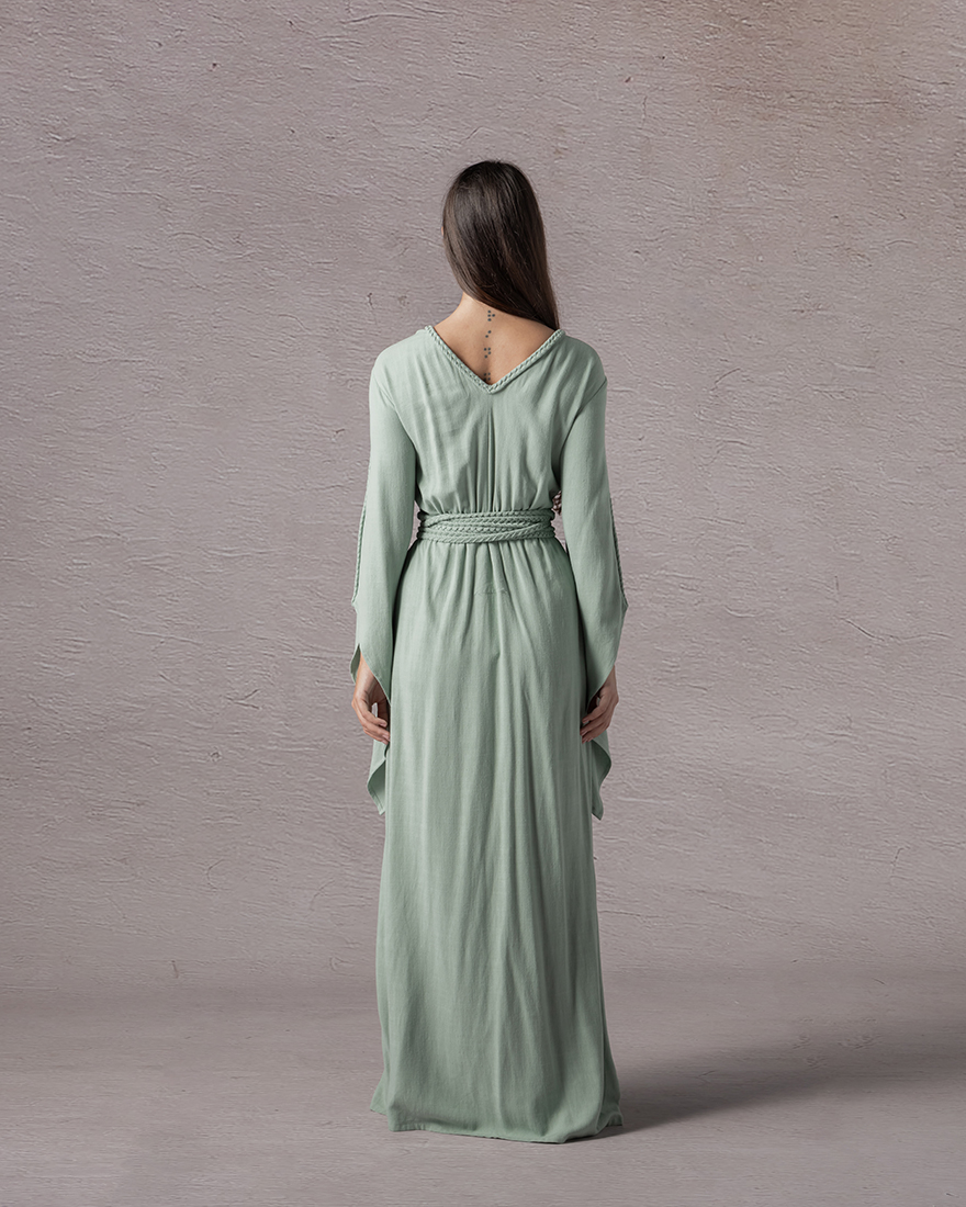 Long widesleeved dress with a braided V neck from