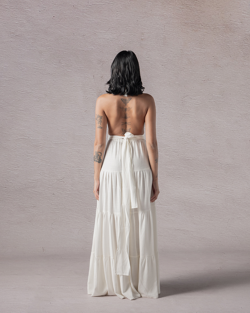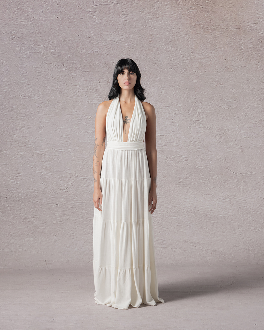 A flowing silhouette that whispers stories of grace, Echoe embodies the essence of timeless beauty. Its design embraces the body with an open back, inviting a breath of freedom and movement.