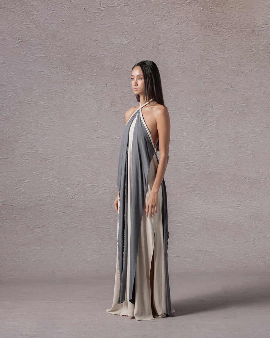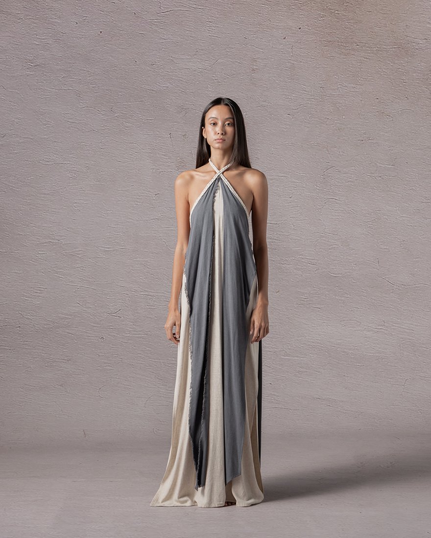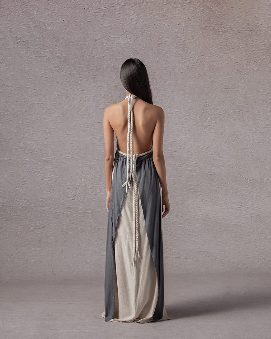 Waistcentered, twocolored backless dress with a