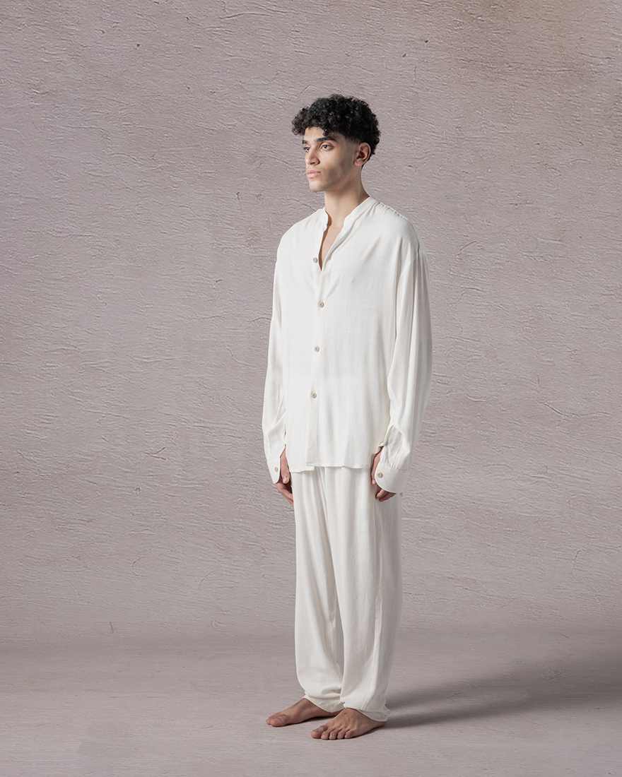 Light on the skin, easy on the form. Grain carries the gentleness of something left in the sun, softened, lived in, quietly familiar. The cut is loose, but not loud. Buttons run down like a thought unfolding, one moment after the next. There's something in the way it falls, in how it doesn't try too hard. Like grain slipping though finders, simple, steady, enough.
