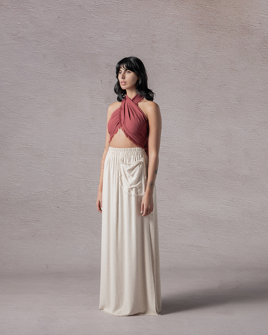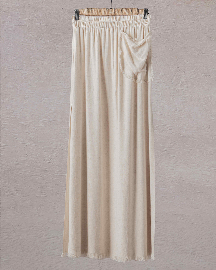Kneelength skirt with raveled edges and side slit