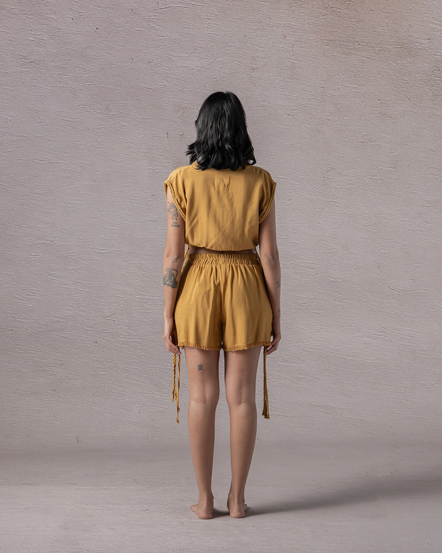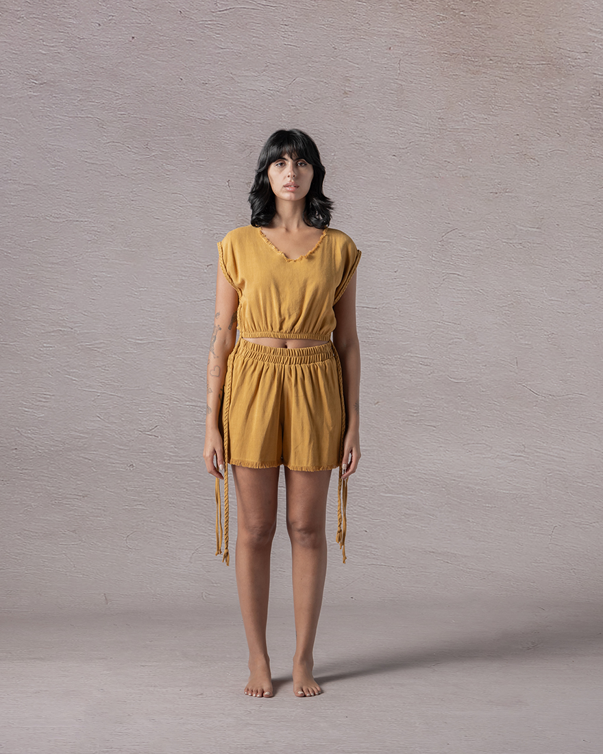 Rush hums with the promise of movement, as it fashioned from a sudden breath of wind. Its sleeves skim the arms with a quiet boldness, offering ease without hesitation. Raw edges trace the neckline like the echo of something unfinished, free, unbound. In its subtle shape lies a gentle urgence, a reminder that life's pulse can be both calm and thrilling all at once.