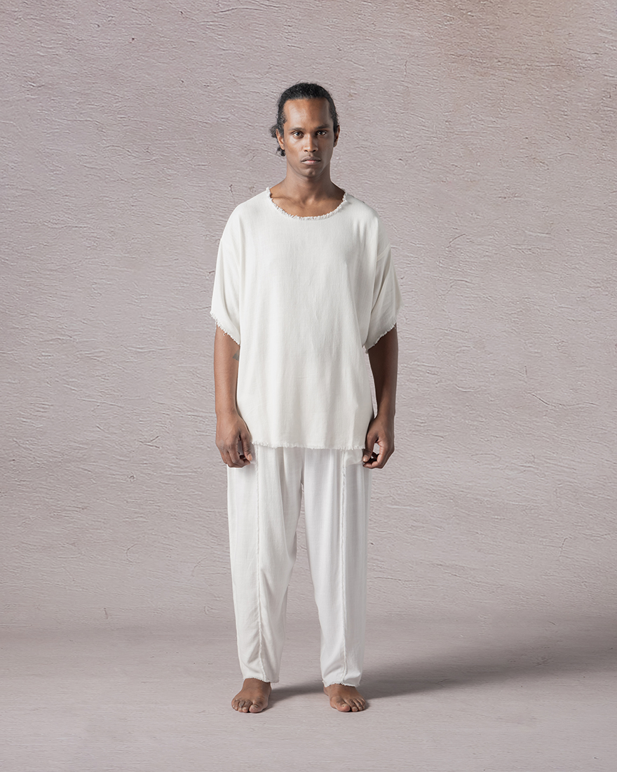 Tamar moves like a thought you haven't spoken yet. Slow, certain and untamed. Its folds don't follow the body but converse with it, falling where they may, rising with breath. A rhythm lives in the cut, not loud but ancient. As if drawn from the ground itself.