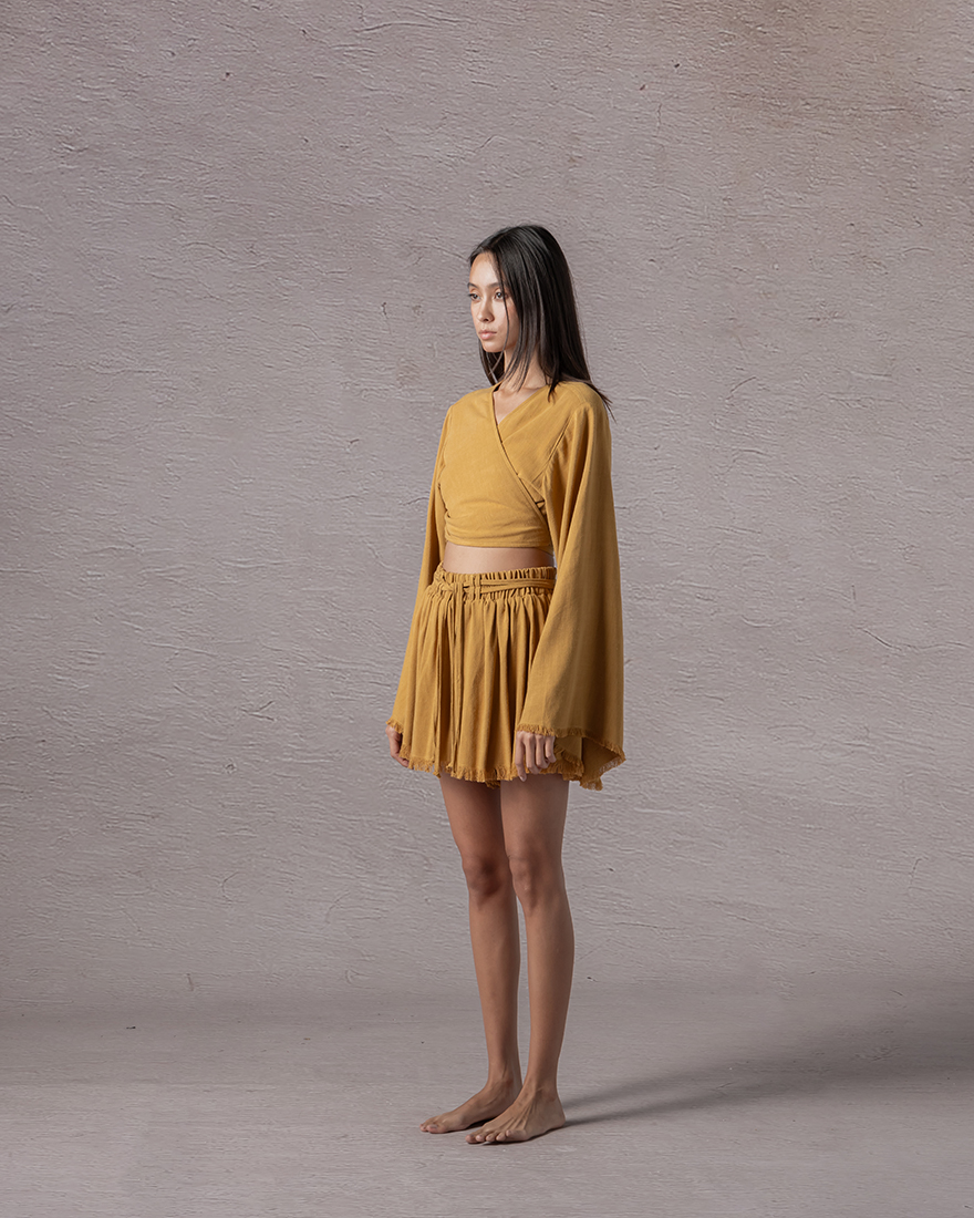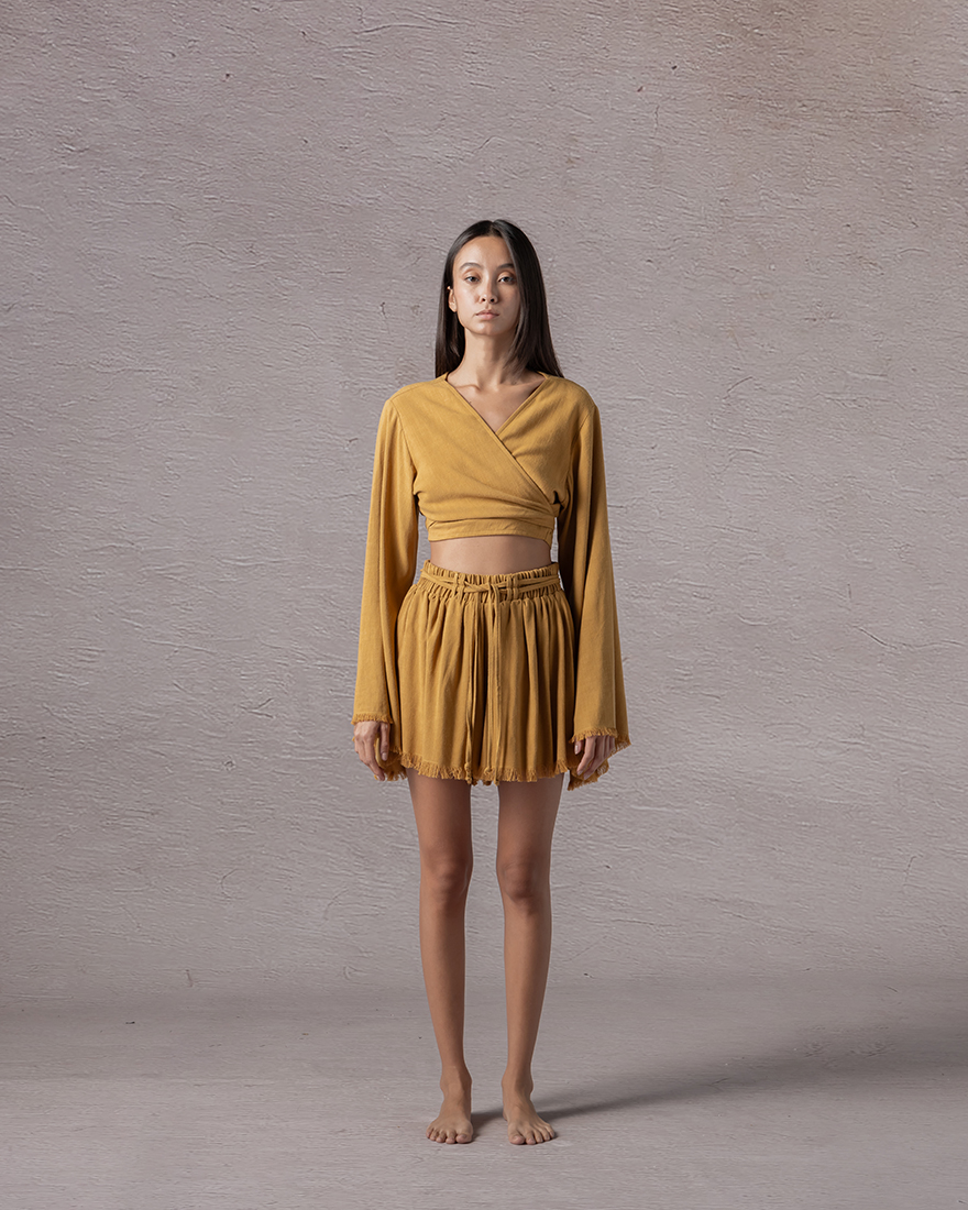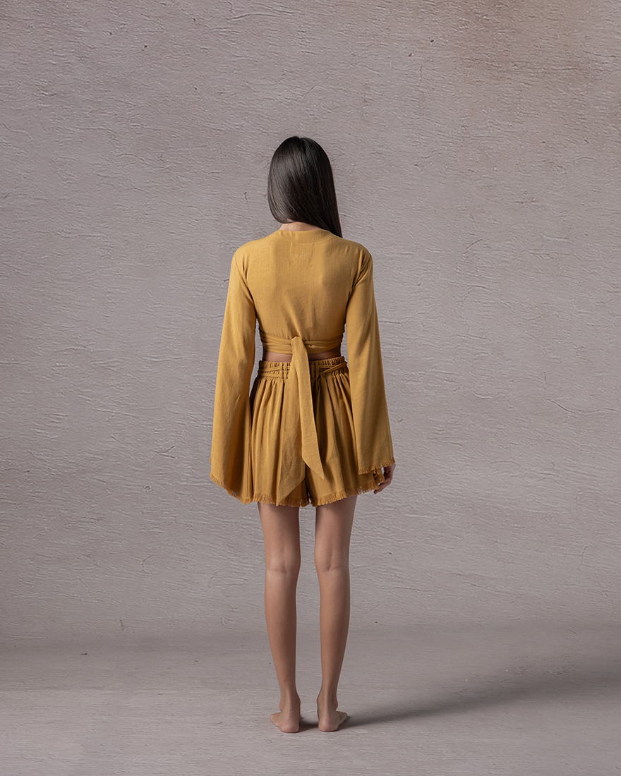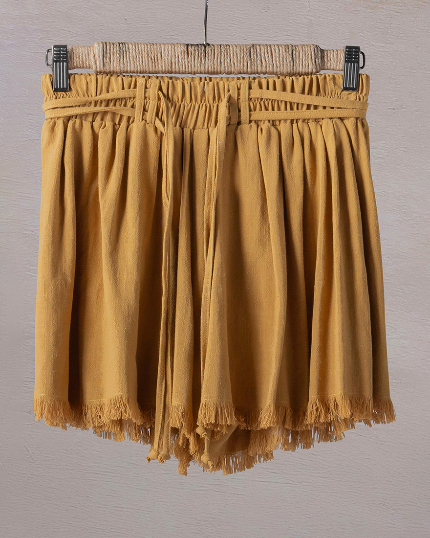 Raveled edged high waist shorts with a double f