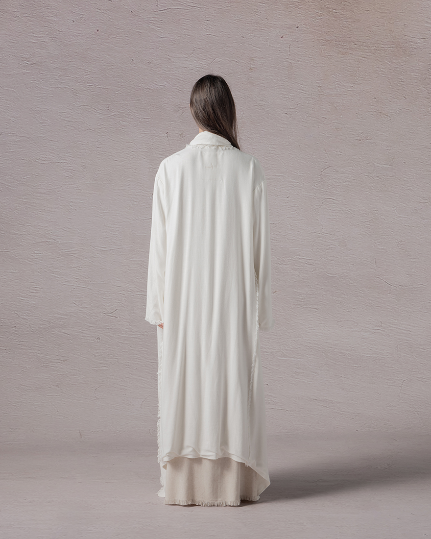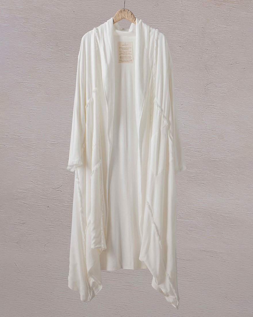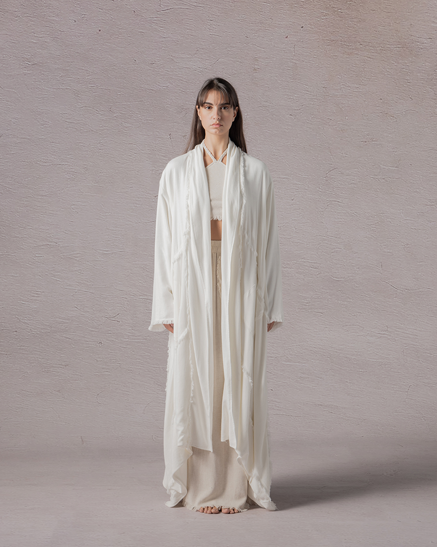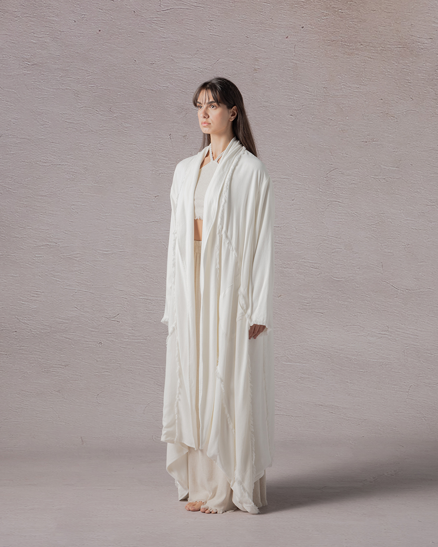 Zephyr drapes softly, whispering grace with each movement. Crafted from light, airy fabric, it envelops the wearer in a gentle embrace. Long, flowing sleeves and a layered design evoke a sense of effortless grace. In its serene, neutral tones, it embodies a tranquil spirit, perfect for those who seek beauty in simplicity and freedom in their expression.